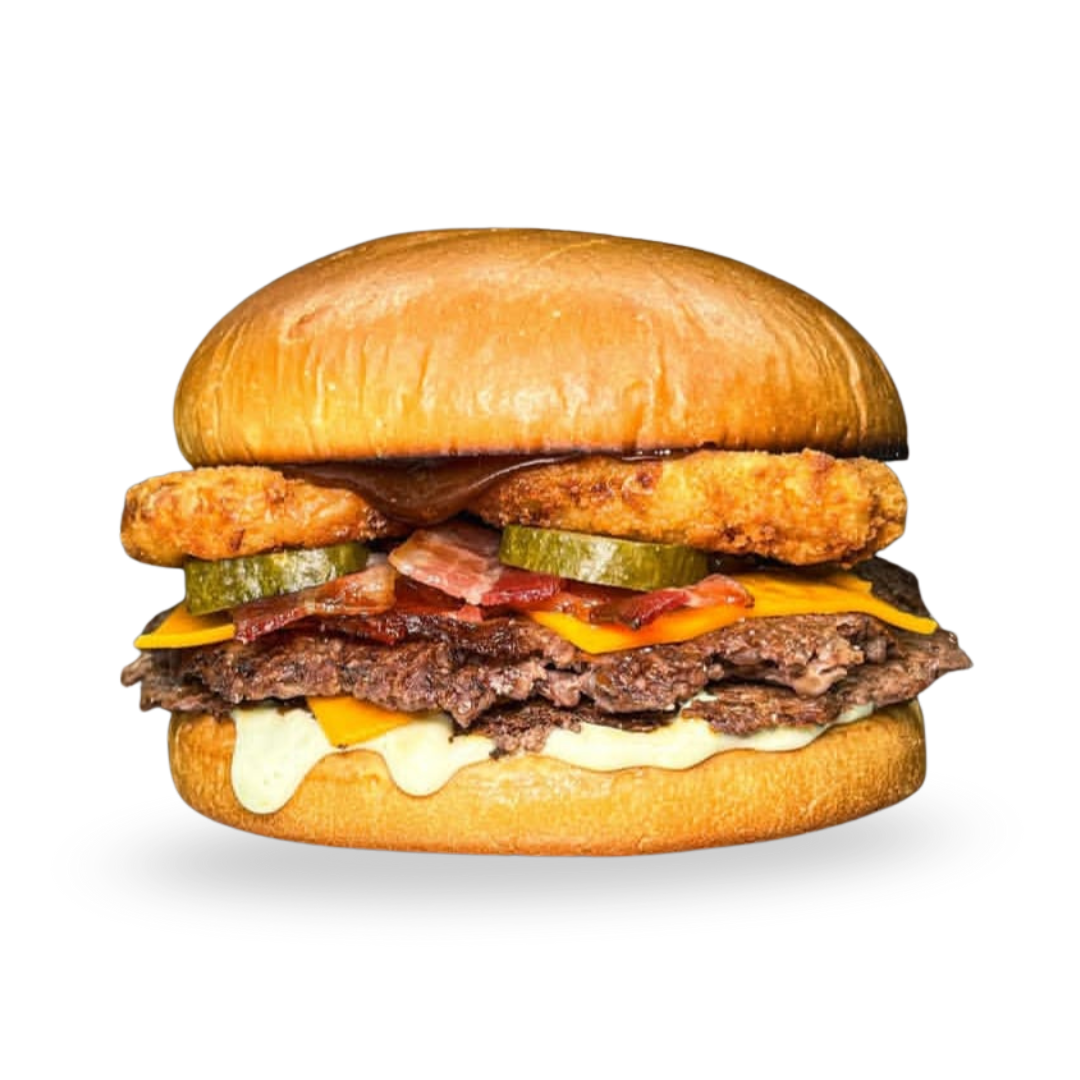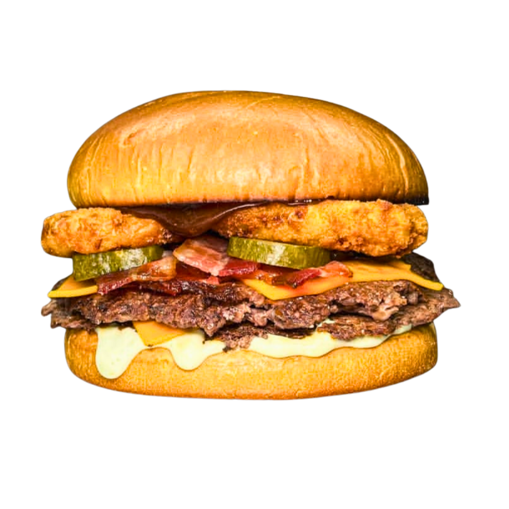 Carne 130 grs, dos bastones de muzza, cheddar, bacon, pepinillos