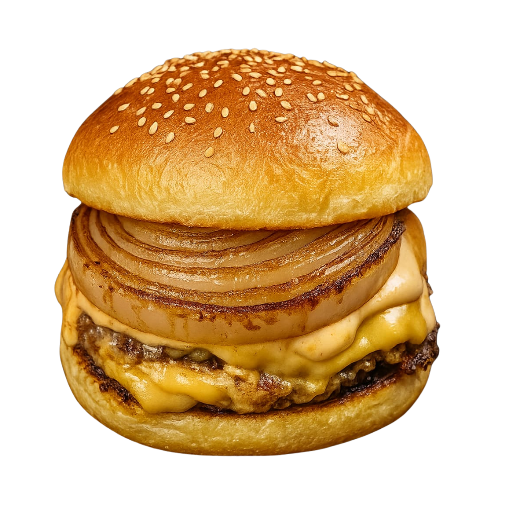 Cheddar, pepinillos, rodajas de cebolla frita, bacon