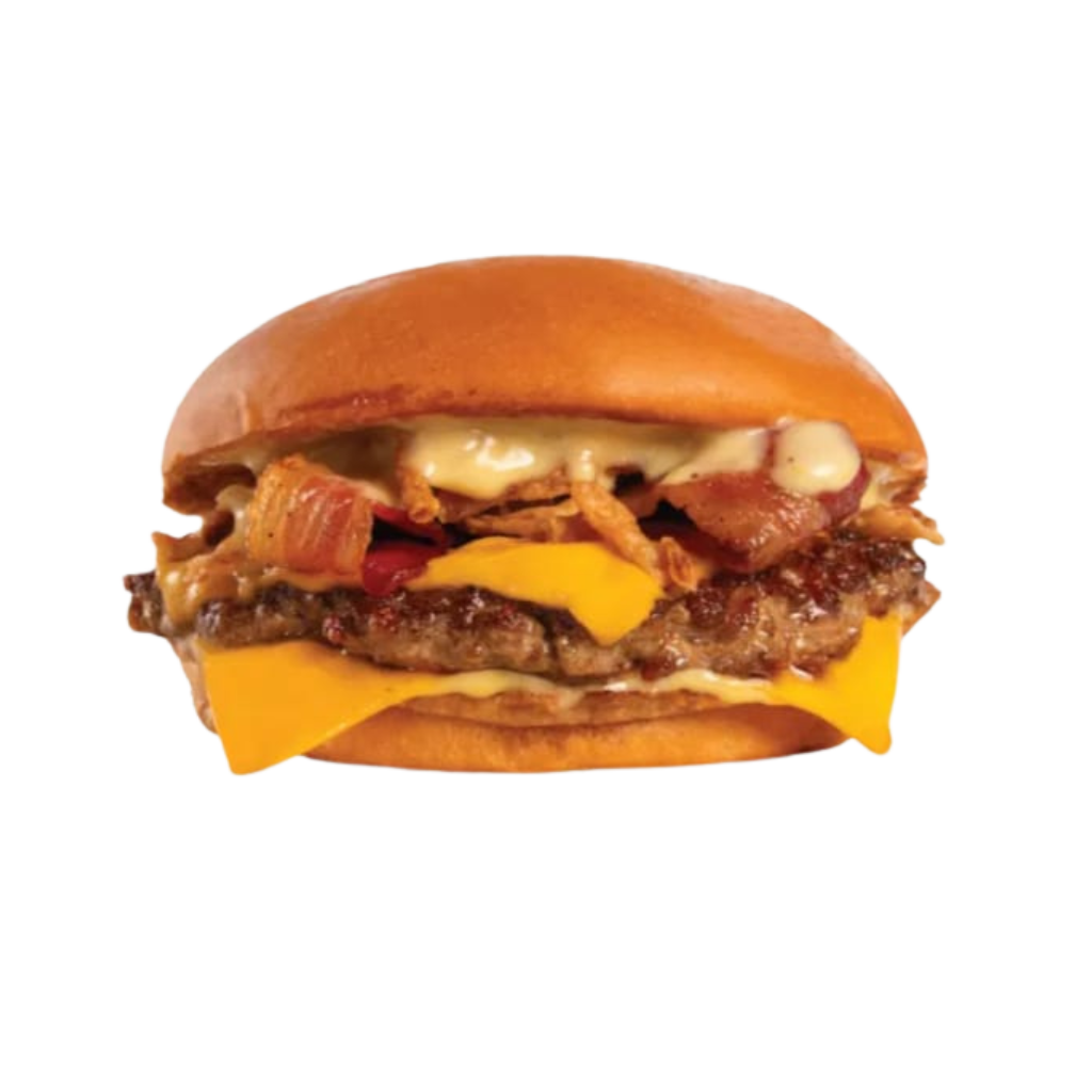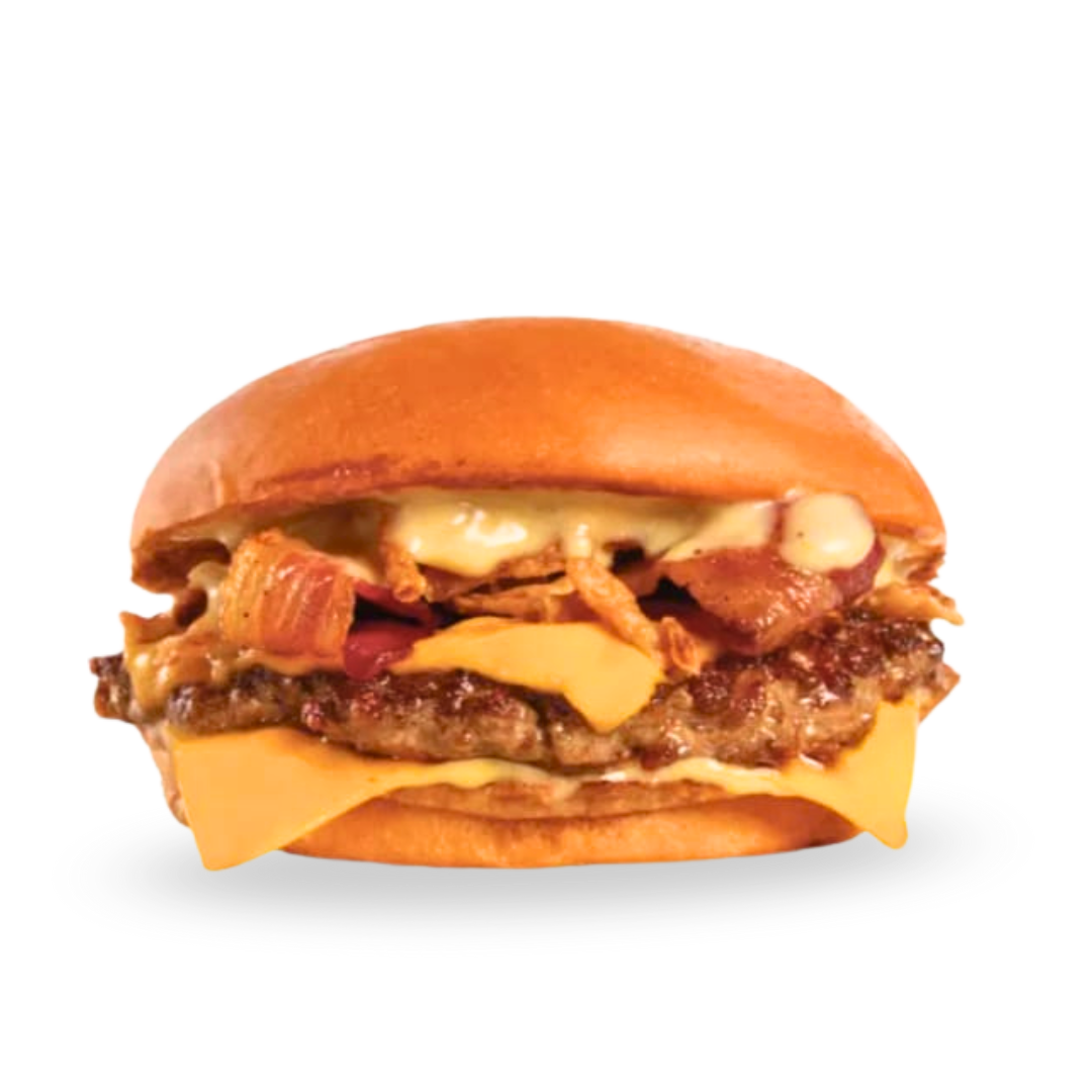Cheddar en la tapa, cebolla crispy, bacon, doble cheddar